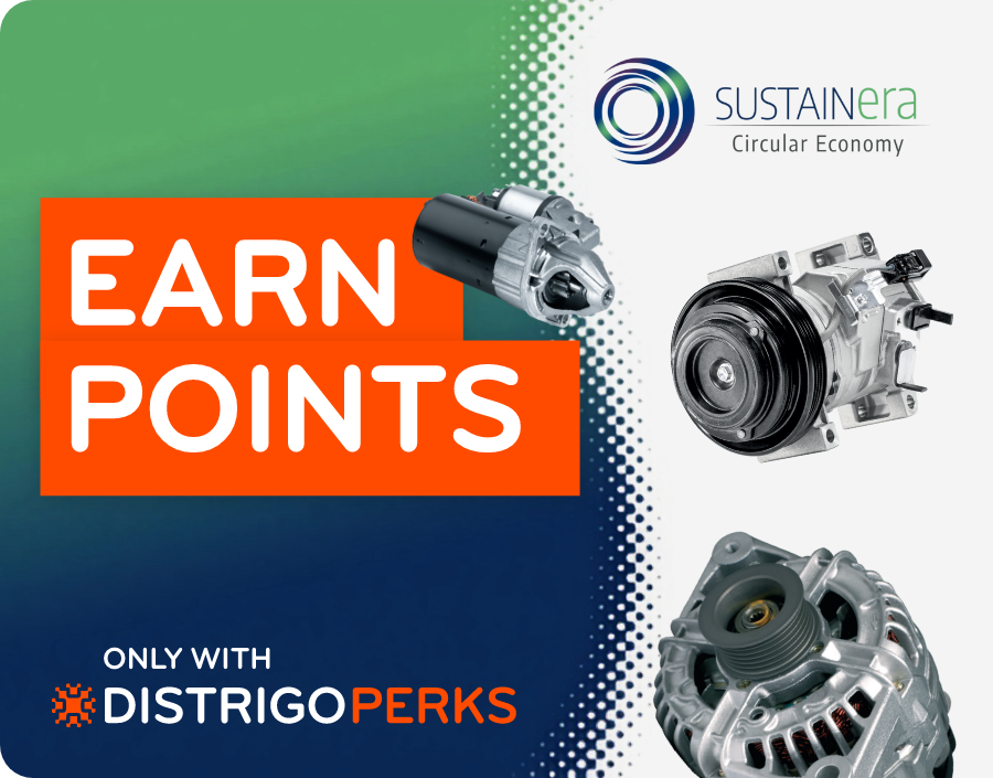 SUSTAINera is one of our four parts ranges which include Eurorepar, Supplier Brand and Genuine parts. When you join our trade parts rewards programme, DISTRIGO PERKS, you will earn points with every parts purchase that can be redeemed as Distrigo Credit, Amazon vouchers, or Snap-on vouchers. You get 1 PERKS point for every £1 spent and 100 points = £1 to redeem.